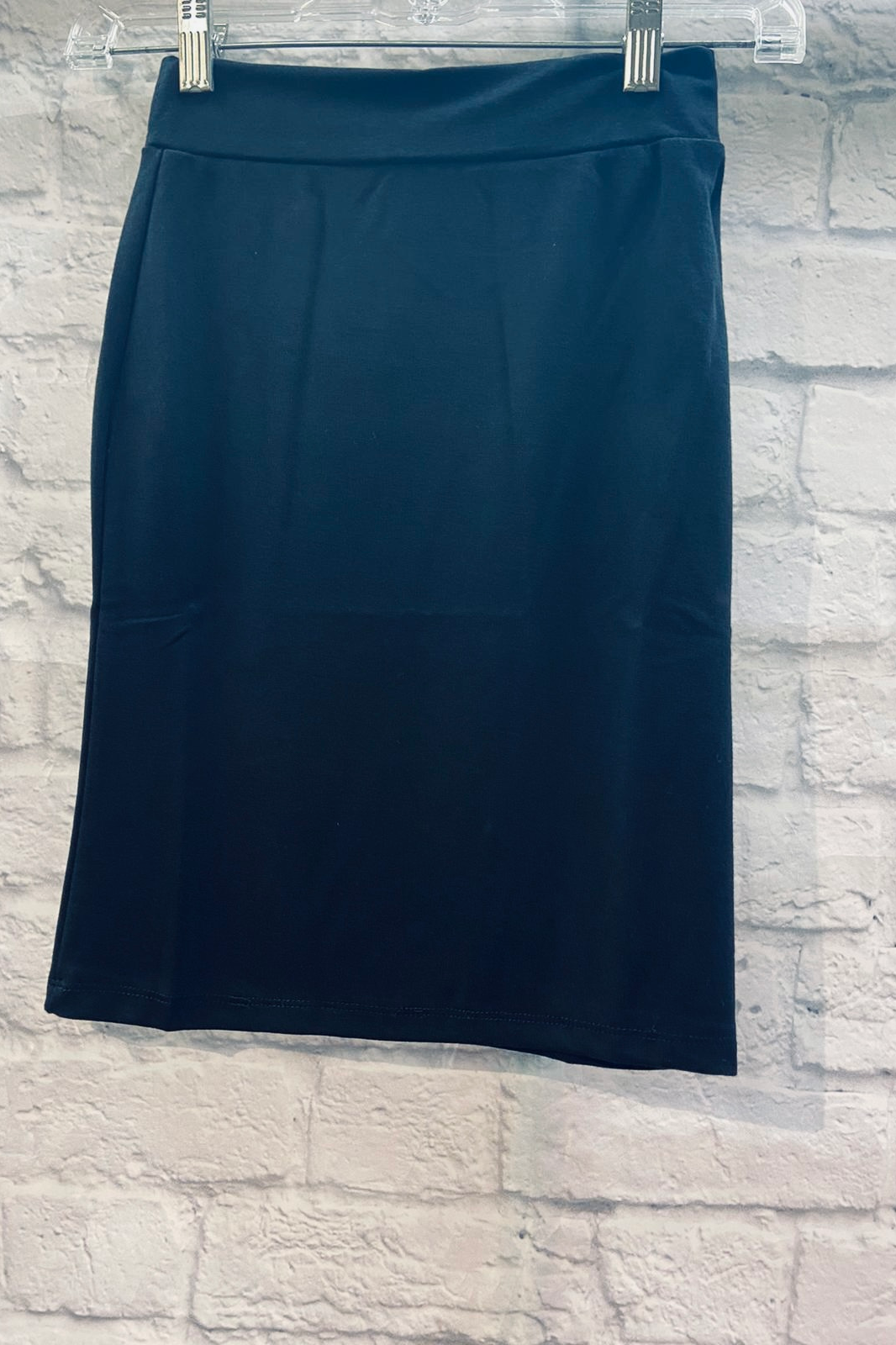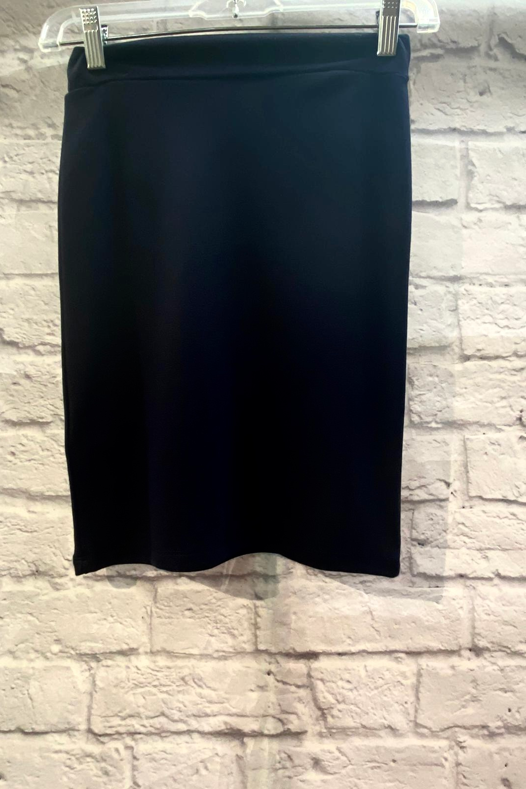 Easy to wear, pull on pencil skirt. Fabric keeps its color, does not fade. Knee length or below.