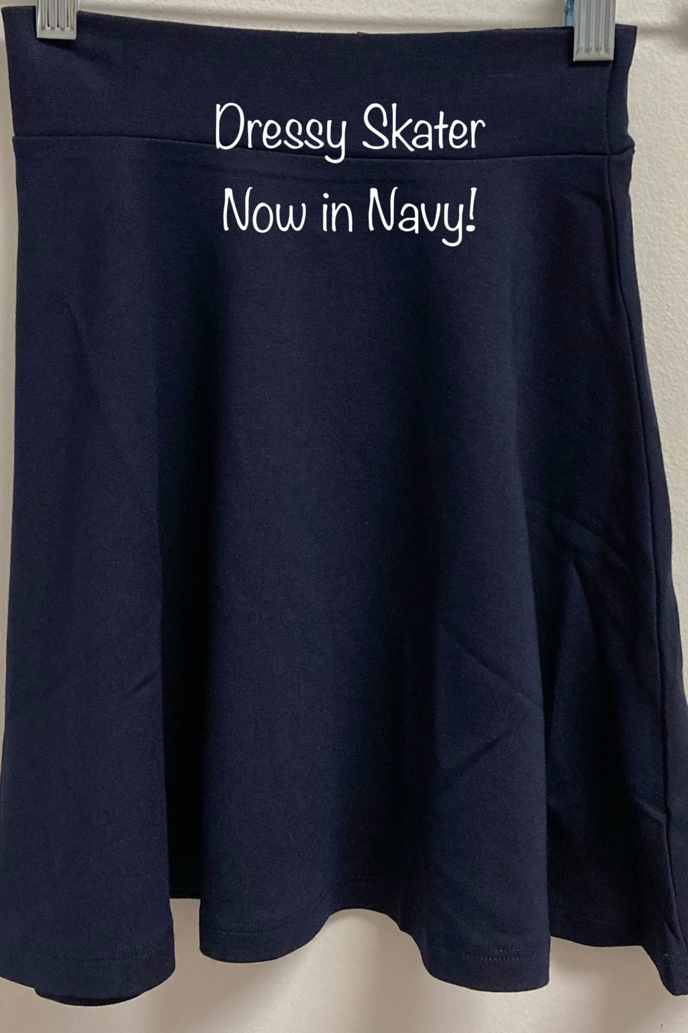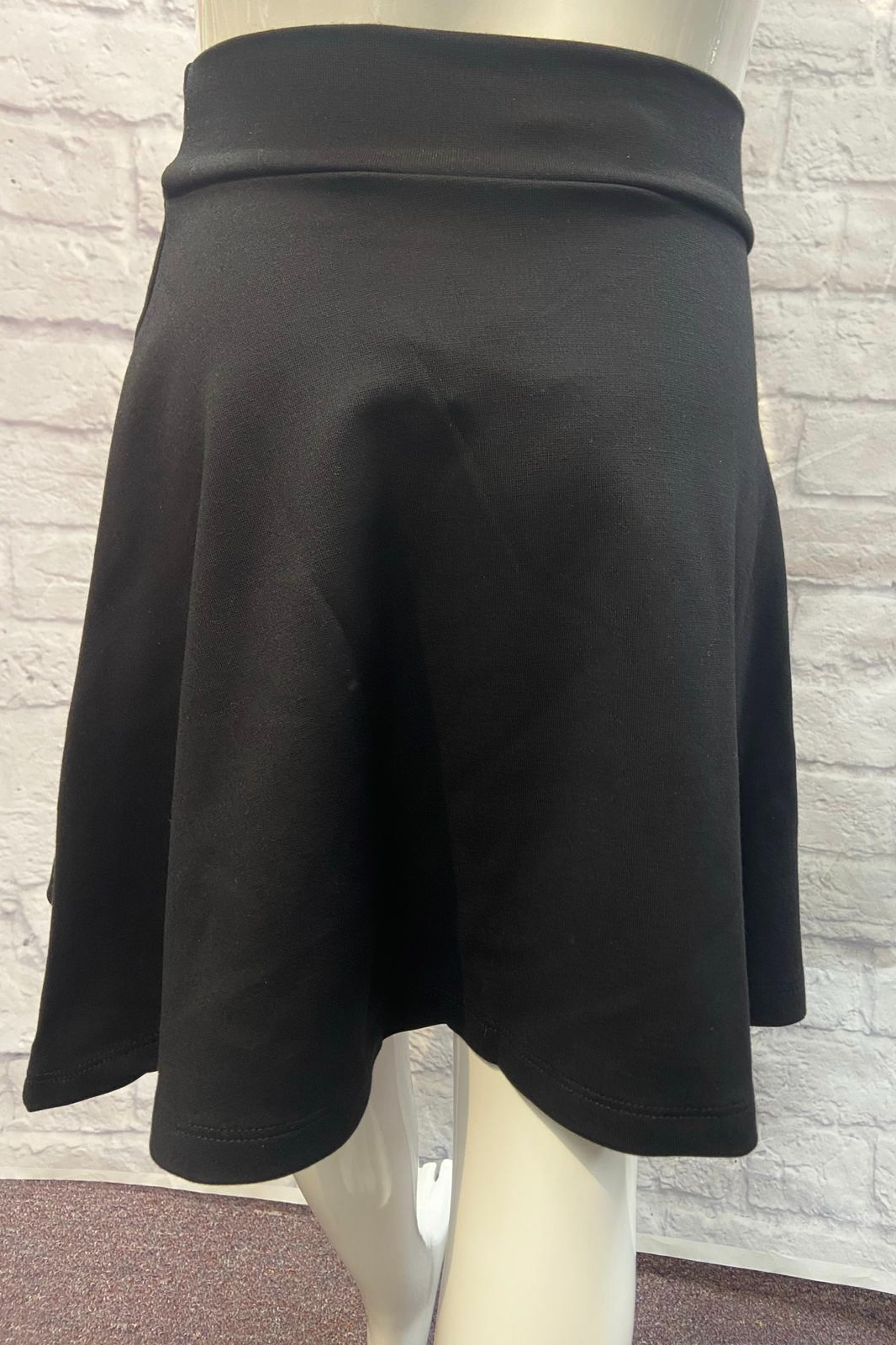 Dressy skater skirt. Black color stays dark black. Very comfortable pull on style. Can be dressed up or worn for everyday. Knee length or below the knee.