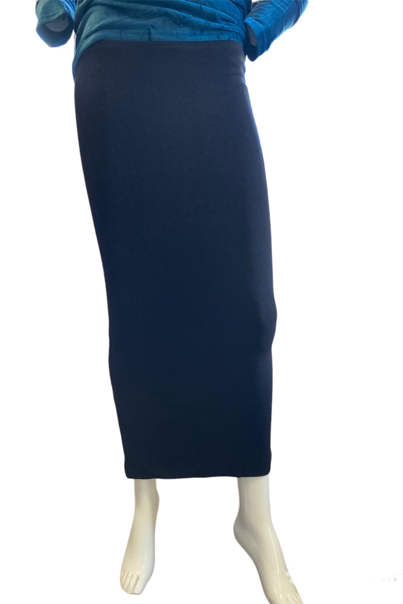 Very fitted long midi skirt with 8" side slit. Sizing up is recommended.