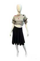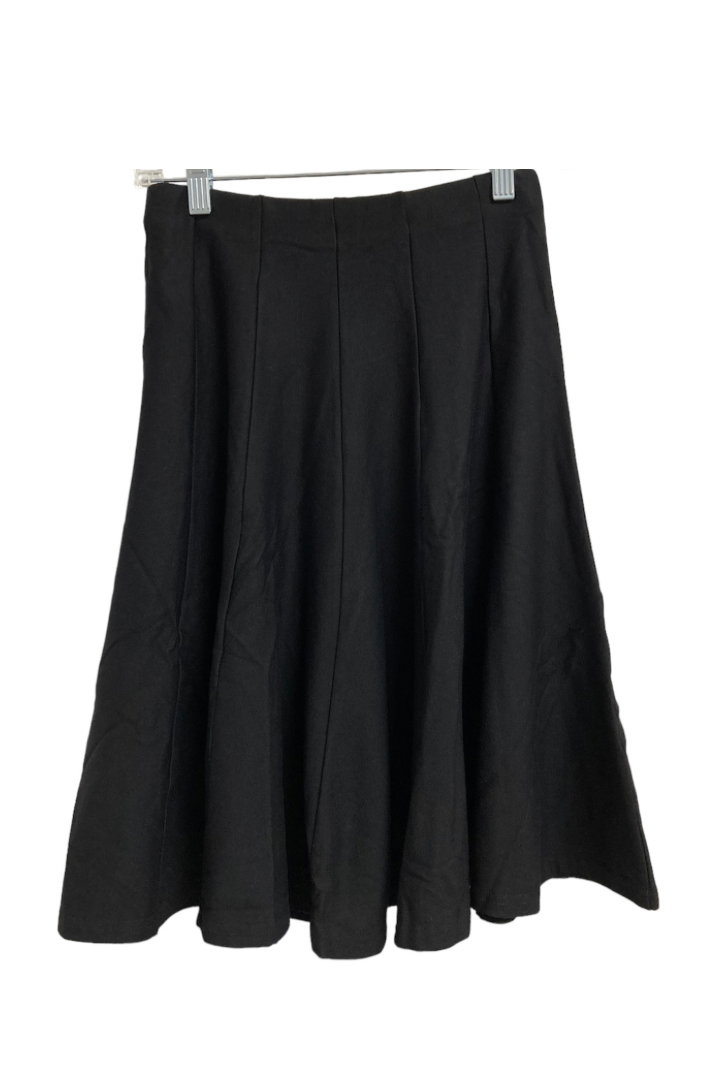 Dressy panel skirt. Viscose fabric does not fade. Pull on skirt. Approximately 23 inches long.