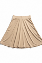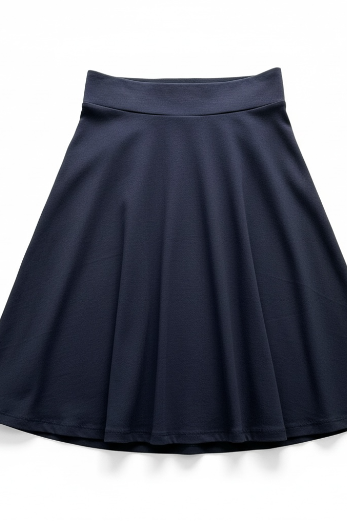 Fit and flair, pull on, knee length skater skirt. The skirt is 23" from the top of the waistband to the bottom of the skirt.