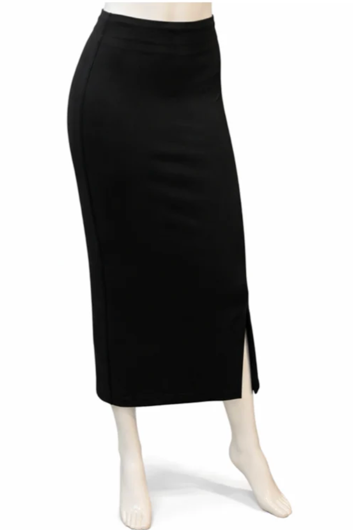 Very fitted long midi skirt with 8" side slit. Sizing up is recommended.