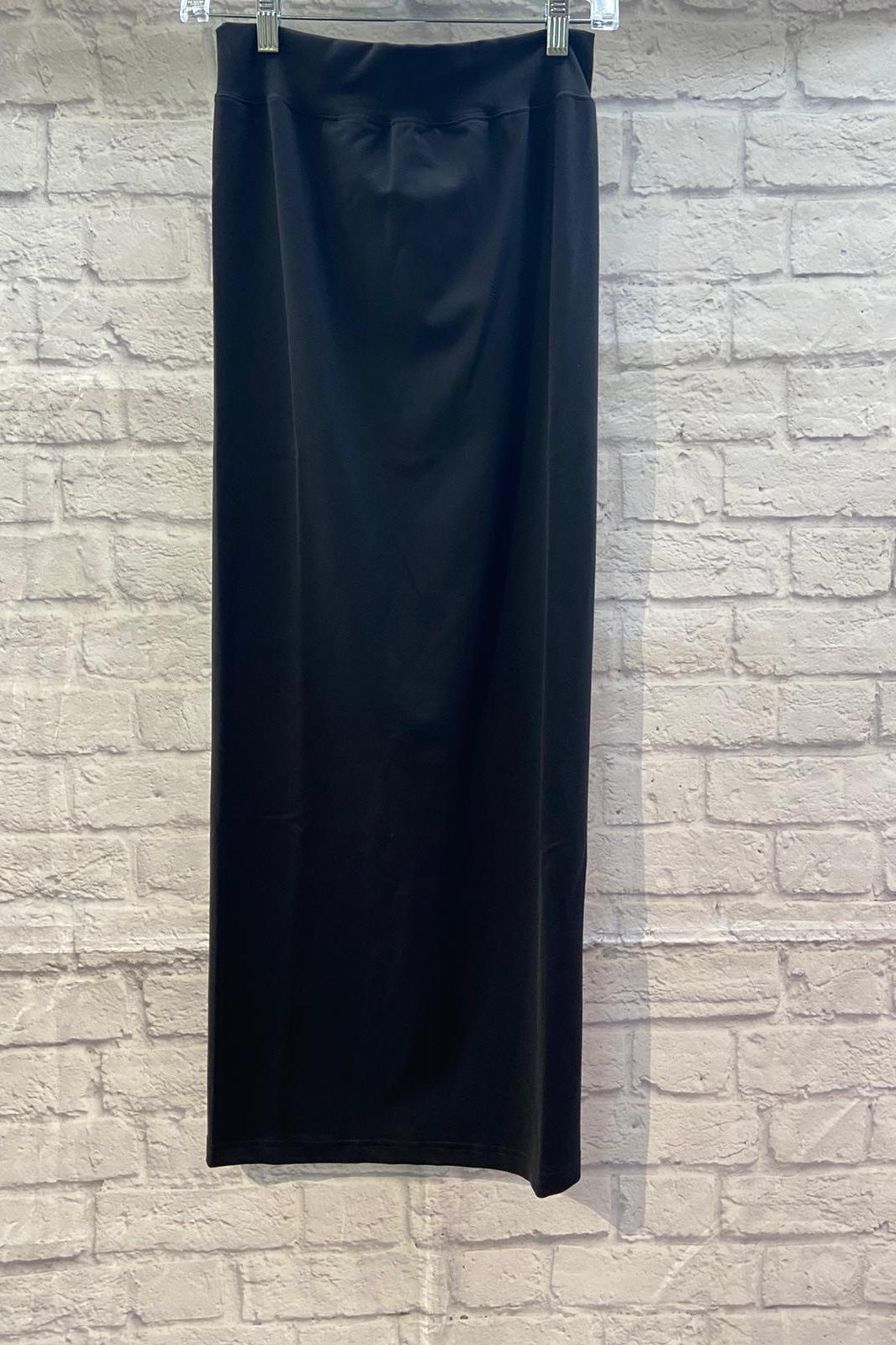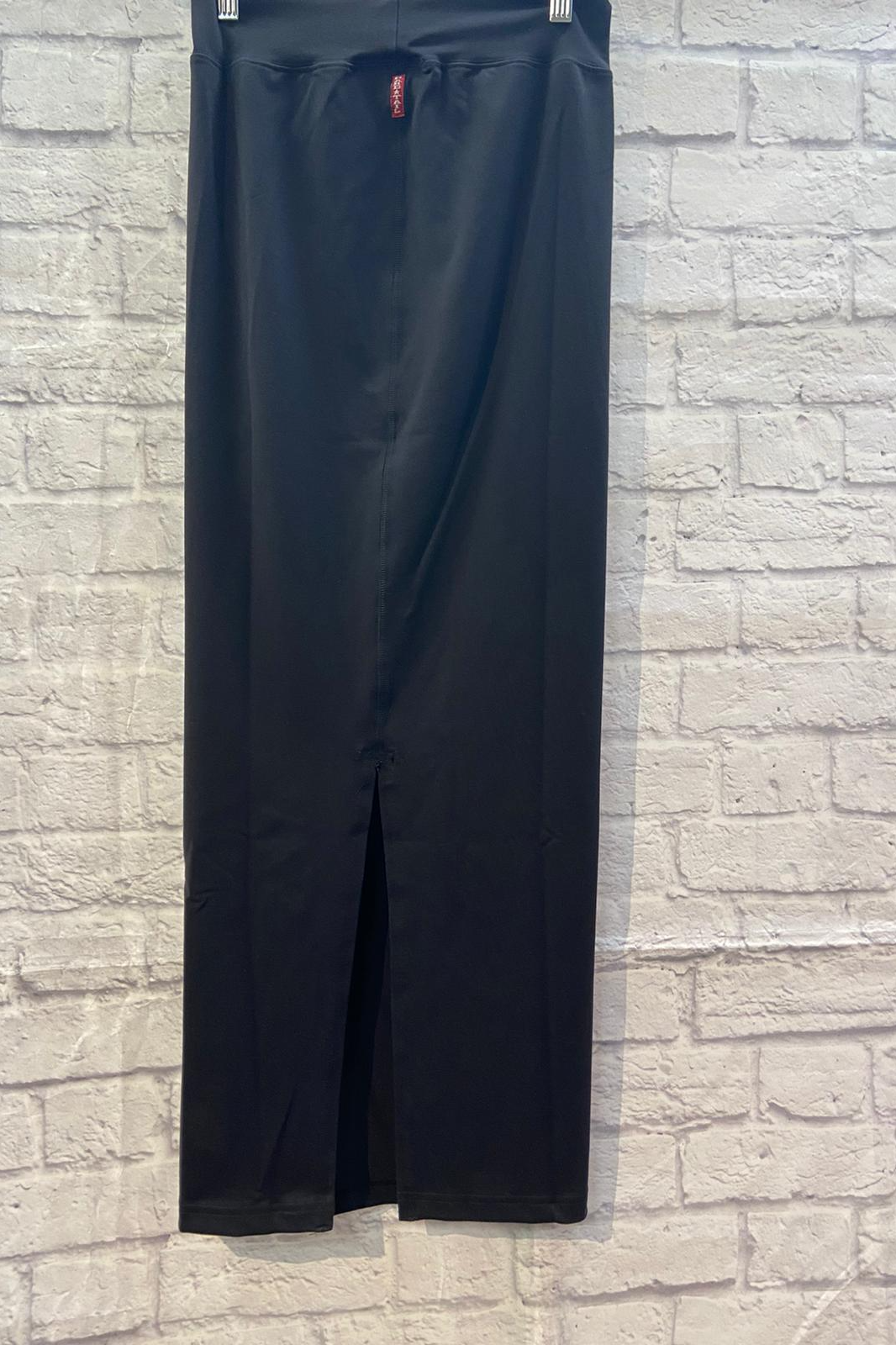 Supplex straight maxi skirt with a 15” back slit. Pull on. Slim, tight fit.