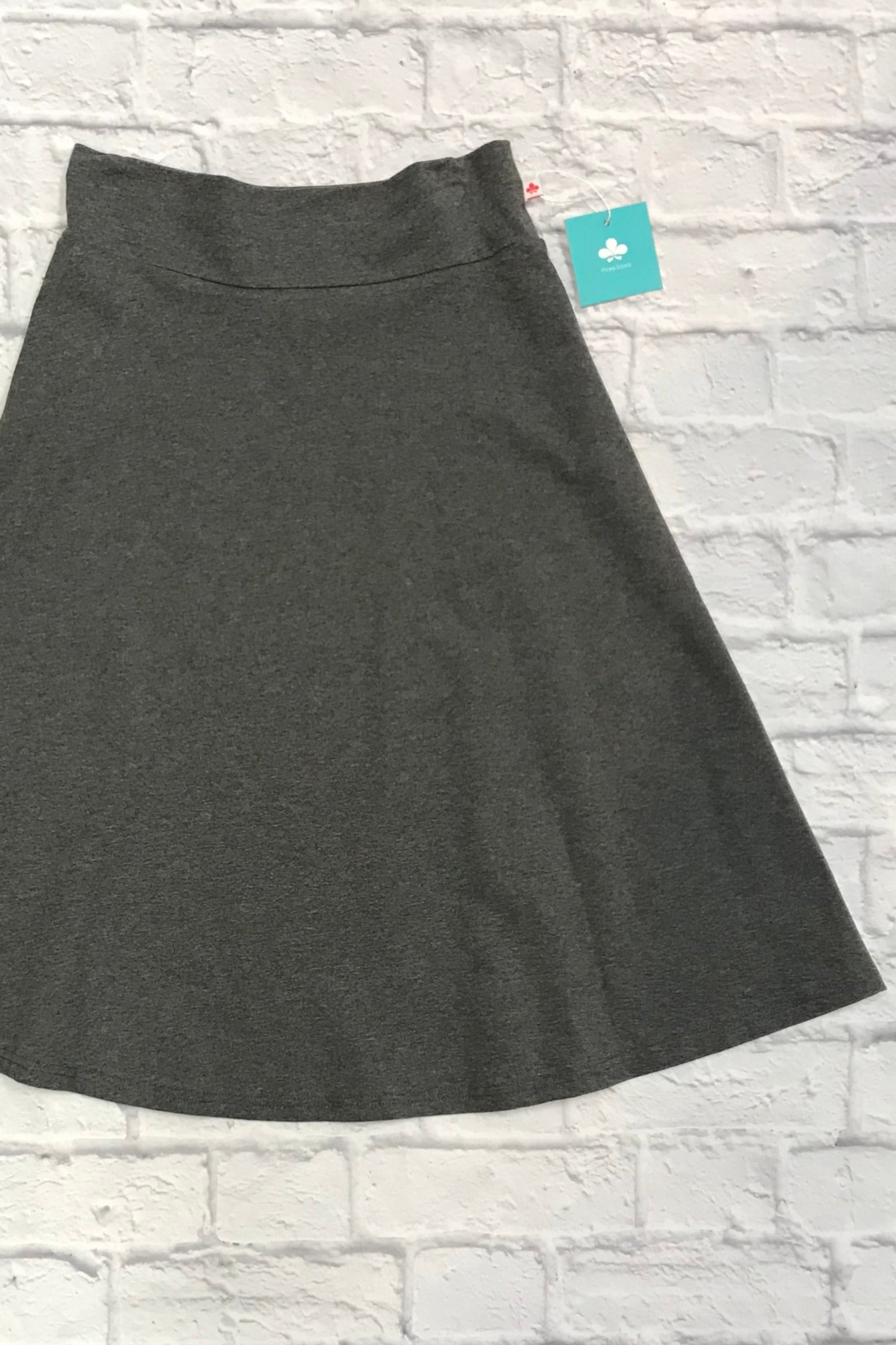 Cotton, pull on, A-line skirt. Smooth and soft fabric. Length is below the knee.