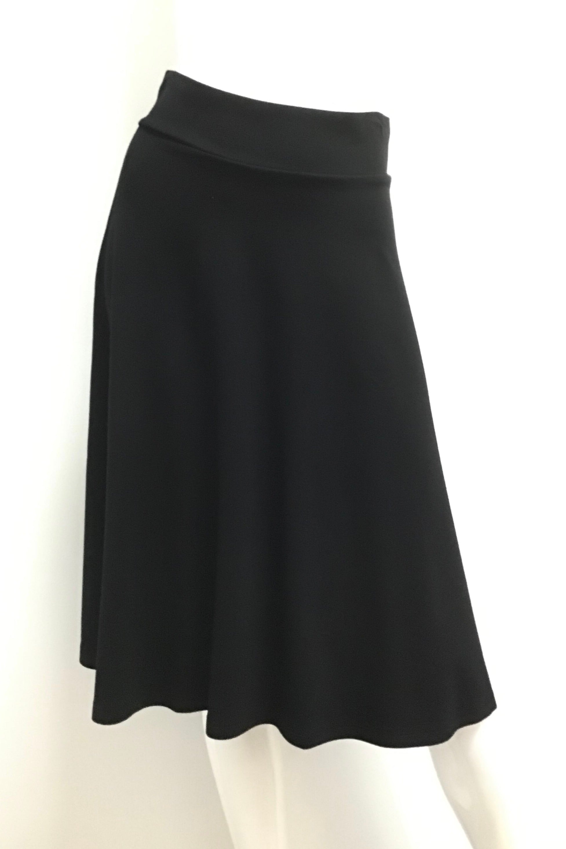 Dressier than cotton, pull on skater skirt. Viscose fabric is deep black with a soft flow. The length measures 26" from the top of the waistband to the bottom. Typically is below the knee.