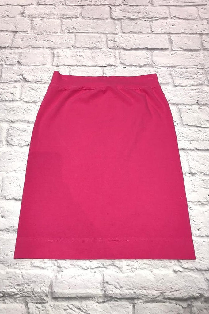 Thick cotton pull on pencil skirt. Knee length or below the knee. Center back seam.